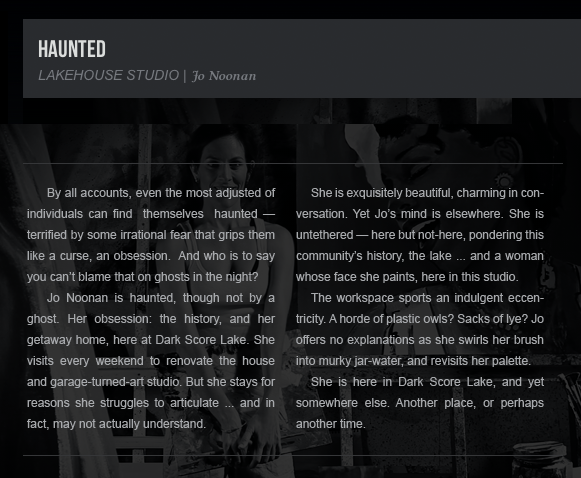 A&E wanted a smart, slick — and scary — experience that would whet the appetites of casual viewers and longtime Stephen King fans. Campfire concocted a multimedia narrative that delivered. Embracing the "lo-fi" verve of Bag of Bones' rural setting, Dark Score Stories used timeless storytelling media such as black-and-white photojournalism, NPR-style audio interviews and journal-like writings from a fictional photographer — all documenting the fictional community of Dark Score Lake ... and hinting at its bloody history.